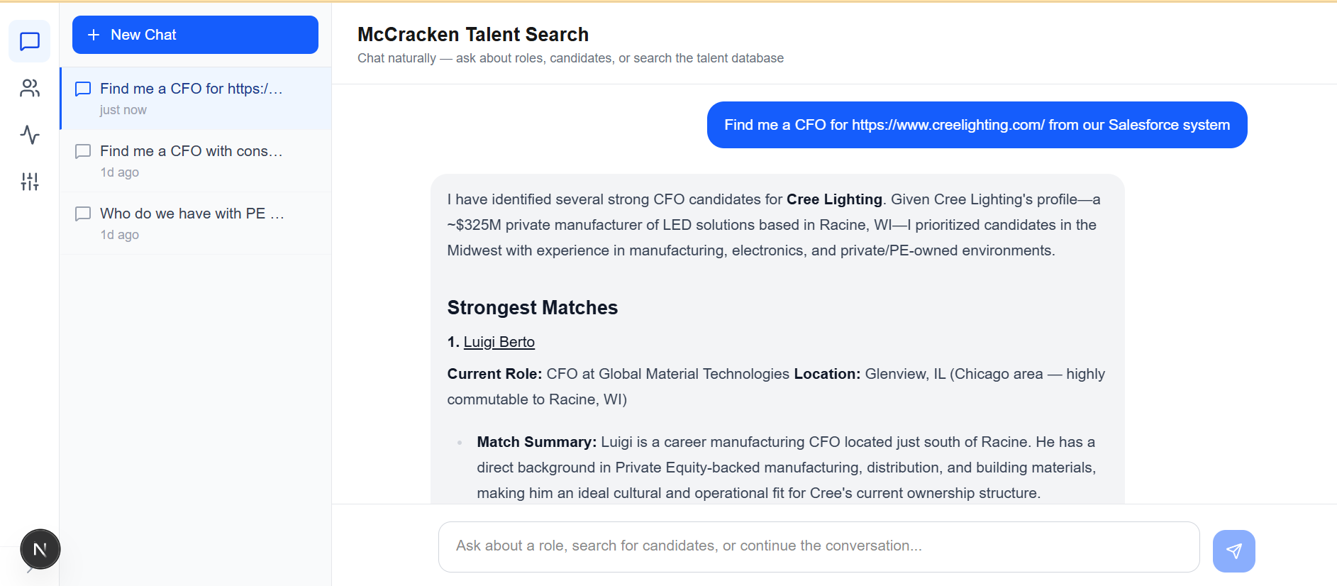 An executive search firm needed to replace a fragmented manual workflow (exporting data, running enrichment tools, uploading JSON to ChatGPT) with a single system connected to Salesforce.